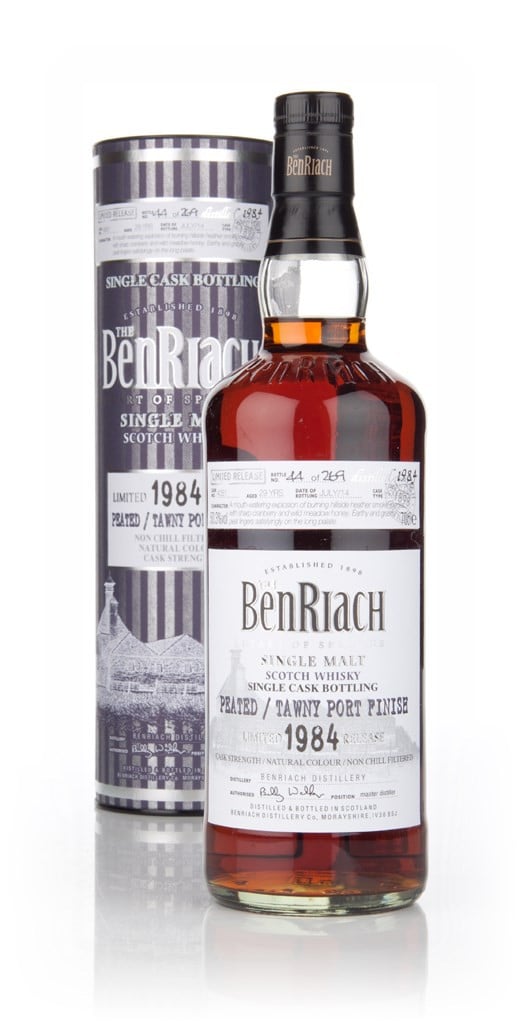 A 29 year old single malt from the Benriach distillery, released as part of their 1th batch of single cask bottlings. This peated whisky was distilled in 1984 and bottled in July 2014, but not before it was finished in a Tawny Port cask. 269 bottles were produced.