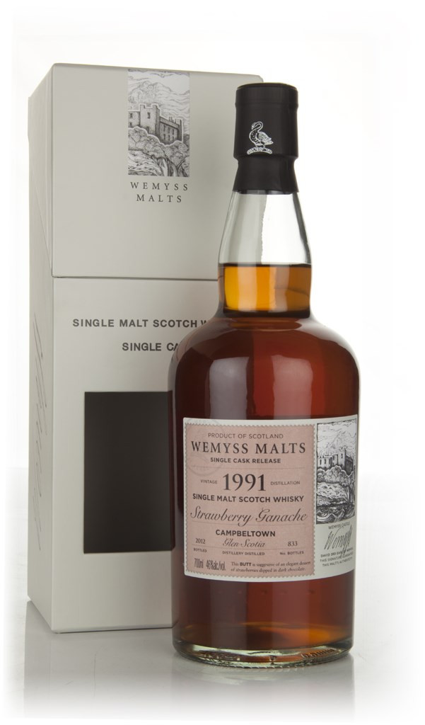 With the alluring name "Strawberry Ganache", this is a 1991 vintage from Wemyss Malts. It was distilled at Glen Scotia before maturation in a single cask for 21 years. There are 833 bottles available.