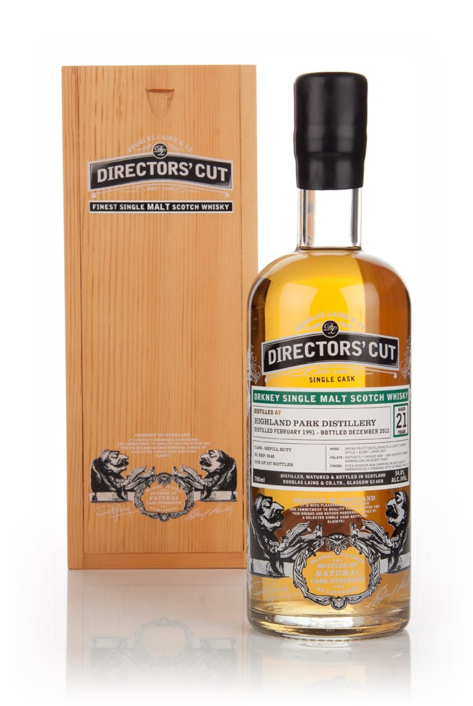 A Directors' Cut bottling of 21 year old Highland Park single malt Scotch whisky, distilled on the Orkney Islands in February 1991, matured in a refill butt until December 2012. 227 bottles of this fruity, smoky single malt were produced.