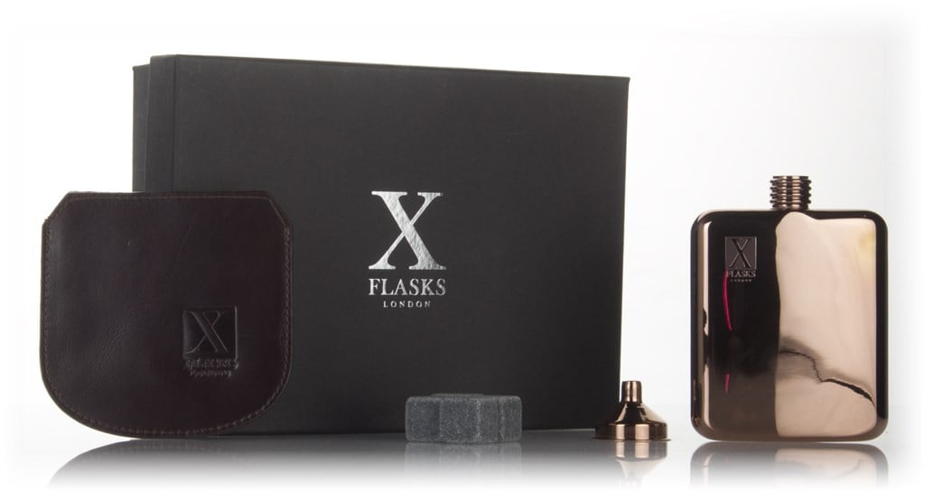 A rather handsome rose gold flask from the X Flasks range, presented alongside a brown leather pouch to house it, as well as a funnel and four stone ice cubes.