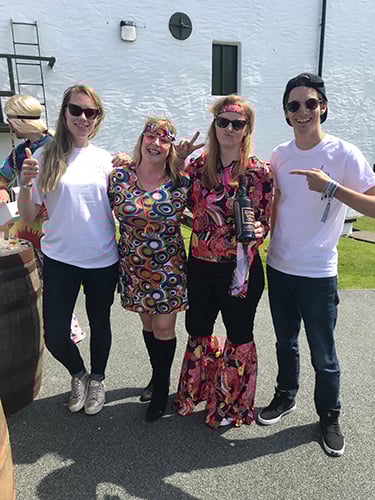 Welcome to 1960s Ardbeg! We were warned back in March that attending Ardbeg Day 2018 would result in serious time travel, but little could prepare us for the sixties extravaganza that awaited (did you see Mickey Heads’ attire? That medallion). From the second we rolled down the Ardbeg drive (no designated driver today, we’re partying on and picking up the wheels tomorrow!) to when we departed later, drams in hand, we were enveloped in the bright, bustling world of a 1960s village party, complete with flares galore, flowers painted or stuck on every available surface and the hits in abundance from the incredible live band.