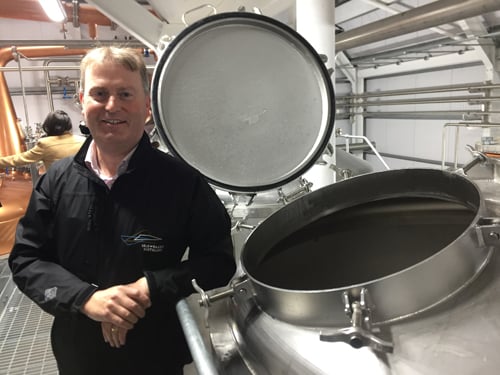 Co-founder Alasdair Day and one of the washbacksRaasay has one pair of stills: one wash and one spirit copper pot sit at the end of the production space right by a full-height glass window overlooking the bay and across to Skye. The 5,000 litre wash still comes equipped with a water-jacketed lynne arm “so we can get the spirit denser earlier”, said Day.
