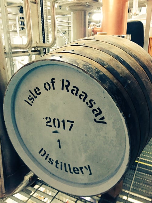 The Isle of Raasay Distillery’s first caskSitting just across from the pair of stills lies the first Isle of Raasay Distillery cask. And it’s got an intriguing history. The French oak barrique had a former life holding three batches of Tuscan red wine, before housing local beer, and also accommodating While We Wait whisky (the single malt from an unnamed distillery vatted to represent the future Raasay character. The idea is to enjoy the whisky literally while we wait for the new spirit to come of age).