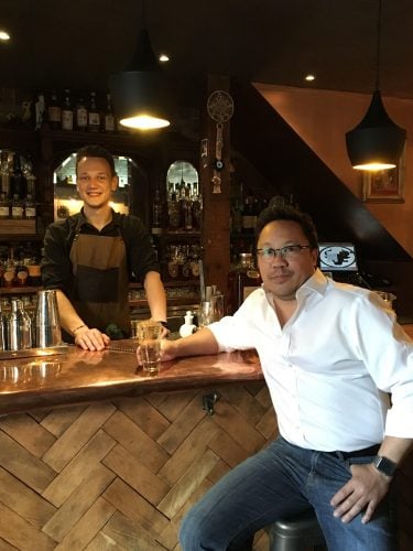 Ricardas Plavko (L), bartender at Bull in a China Shop, and the bar’s co-owner, Simon Chan