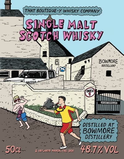 In this label we find a rendering of the distillery, as viewed from the main road outside. There’s a cheeky young scamp running across the foreground, who’s evidently purloined a bra from the changing rooms of the adjacent swimming pool (Which in an incredibly pleasing twist, are heated using the waste heat from Bowmore’s stills).