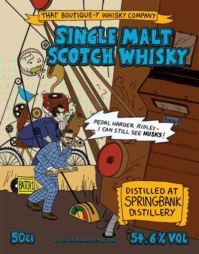 This label features the irrepressible duo from www.caskstrength.net, Neil Ridley and Joel Harrison, operating a somewhat Heath-Robinson contraption being used to drive Springbank’s fantastic old Porteus-Brand Grain mill.