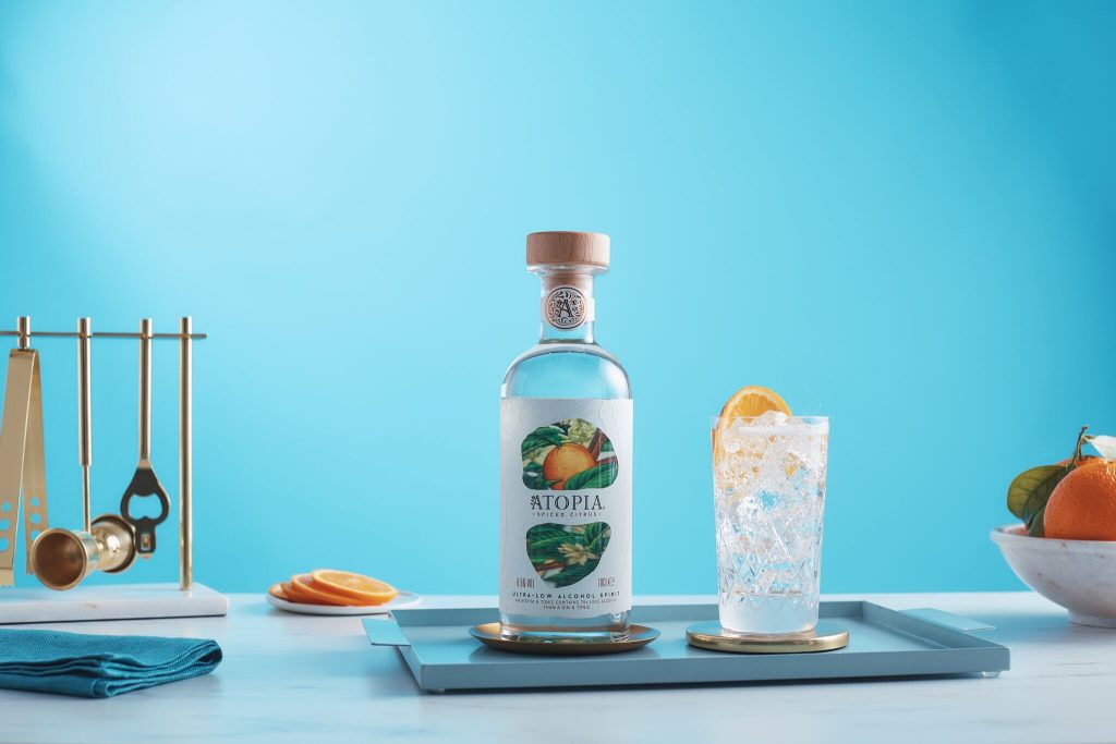 Physical elements aside, alcohol-free producers are also keen to tap into the social ritual associated with drinking and make their offerings as accessible and acceptable as other full-strength products. And not just to appease teetotallers, either. Increasingly, drinkers are mixing traditional spirits with low- and no- options during the same drinking occasion. Take William Grant & Sons’ ‘ultra low alcohol spirit’ Atopia, created by Lesley Gracie, the master distiller behind Hendrick’s Gin. If you’re looking for moderation, Atopia enables you to go out and stay out, according to the website an Atopia & Tonic contains 75 times less alcohol than a Gin & Tonic.