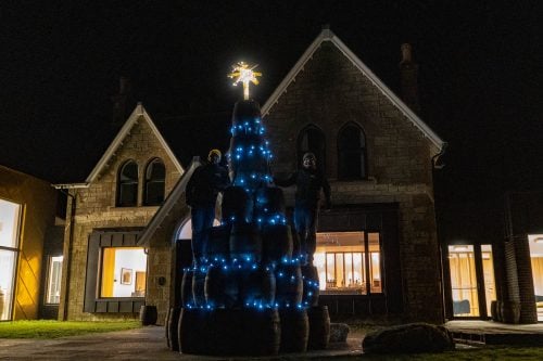 The Isle of Raasay Distillery has come up with an imaginative use for all those barrels that no longer have anything to give. Turn them into an enormous Christmas tree, of course! This isn’t the first time a distillery has found an imaginative use for its old casks. Glenmorangie has built a whole series of marketing campaigns around repurposed wood. You can buy Glenmorangie surfboards, sunglasses and bicycles, all made from staves that once held whisky. But whereas Glenmorangie’s cast offs have been turned into slick objects of desire, the Raasay approach is more rustic. In fact, what they call a Christmas tree is really just a pile of old barrels with a star made up from a broken sherry cask. It was built by Joseph McGowan, distillery operator, and Iain Robertson, head distiller, over the course of an evening (perhaps after a dram or two). “We wanted something that celebrated our first full year of production, and the island doesn’t have a community Christmas tree so this seemed like the perfect compromise,” said tour guide Calum Gillies. “We have it wrapped in a variety of lights, so walking past the distillery or coming over on the ferry at night, you can see it lit up like a, well, Christmas tree.” A bit like a Christmas tree, not a lot.