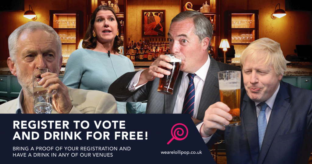 Here’s a good way to combat voter apathy (and we are being asked to vote a lot more than normal). A free drink when you vote. Brilliant! Why did no one think of this before? Well, of course they did. In elections past, unscrupulous politicians would ply the electorate with booze to get them to vote the ‘right’ way. But this new initiative from the Lollipop group of venues around London, is not trying to corrupt, just get people to vote. Simply turn up at a Lollipop bar, like Journey on the King’s Road or Dear Sunny in Hackney, prove that you have registered to vote before 26 November (the closing date), and a free drink will be yours (full details and list of venues here). Founder Seb Lyall had this to say: “We know how important it is for people of all ages and backgrounds to get out there and vote on December 12. These elections will have a significant impact on our industry and we want as wide a group of voices to be heard as possible.” Make sure, however, that you vote sober, or you never know who we might end up with.