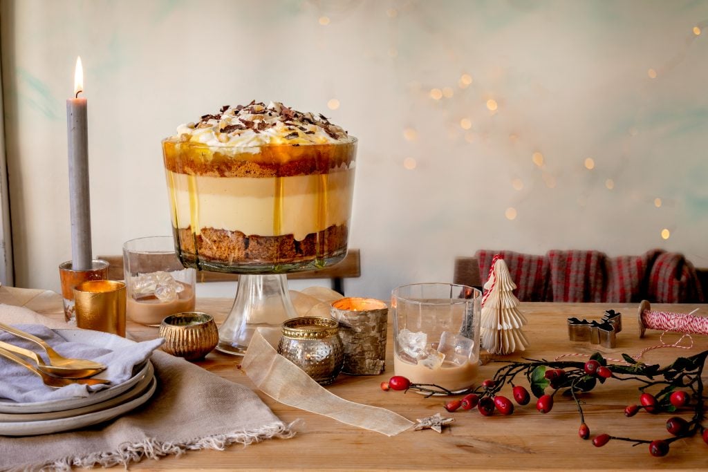 6) To assemble the trifle, cut up the ginger cake into small squares and place them in your trifle dish. Spoon the coffee onto the cake layer followed by a layer of vanilla custard and biscuit-flavoured custard. Sprinkle on a layer of crushed gingernut biscuits and then spoon the Baileys Original Irish Cream layer on top. Decorate with more gingernut crumbs, grated milk chocolate, a sprinkle of edible glitter and drizzle with extra golden syrup if you’d like.