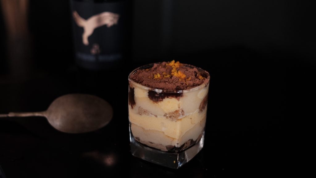 6 free-range egg yolks, 200g sugar, 450g mascarpone, 350ml cream, 1tsp vanilla extract, 100ml Quick Brown Fox coffee liqueur, 1 packet of Savoiardi sponge fingers, orange zest to garnish