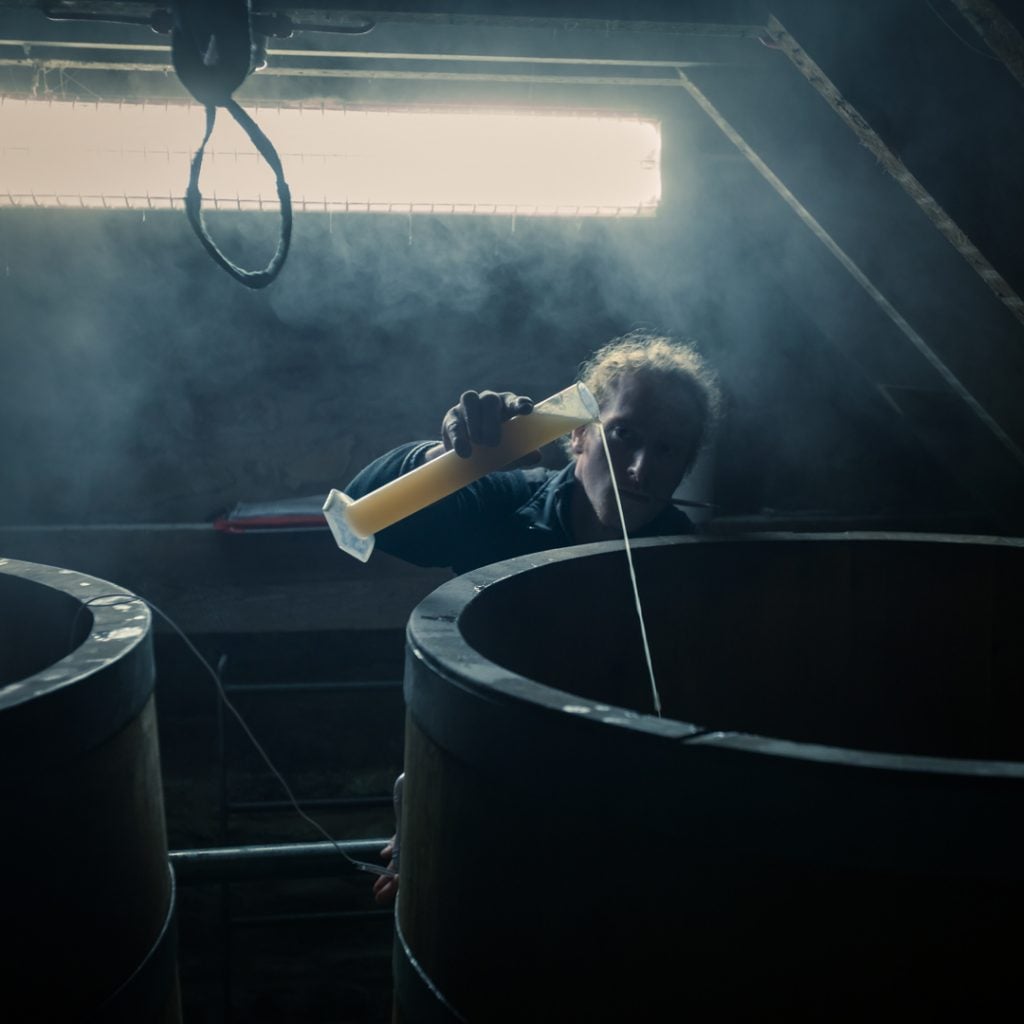 On top of the individual yeast strains, other variables such as temperature, PH levels, oxygen and nutrient levels and bacteria all influence the flavour of the spirit. “Fermentation time is quite a big one as well, because the longer you leave it in the washback, the more room you’re giving for the influence of bacteria and wild yeast,” says Thompson. “We’ve got wooden washbacks that we leave open, and earlier this week we didn’t pitch any yeast for about 36 hours to allow a natural fermentation to start. The results flavour-wise were outstanding. I suspect the yield will be significantly decreased, but there were some really interesting things that happened. After the 36 hours the wash had soured, it smelt really sulphuric. And then 24 hours after the addition of the yeast, the sulphur had been cleaned up and transformed into some extreme tropical fruit.”