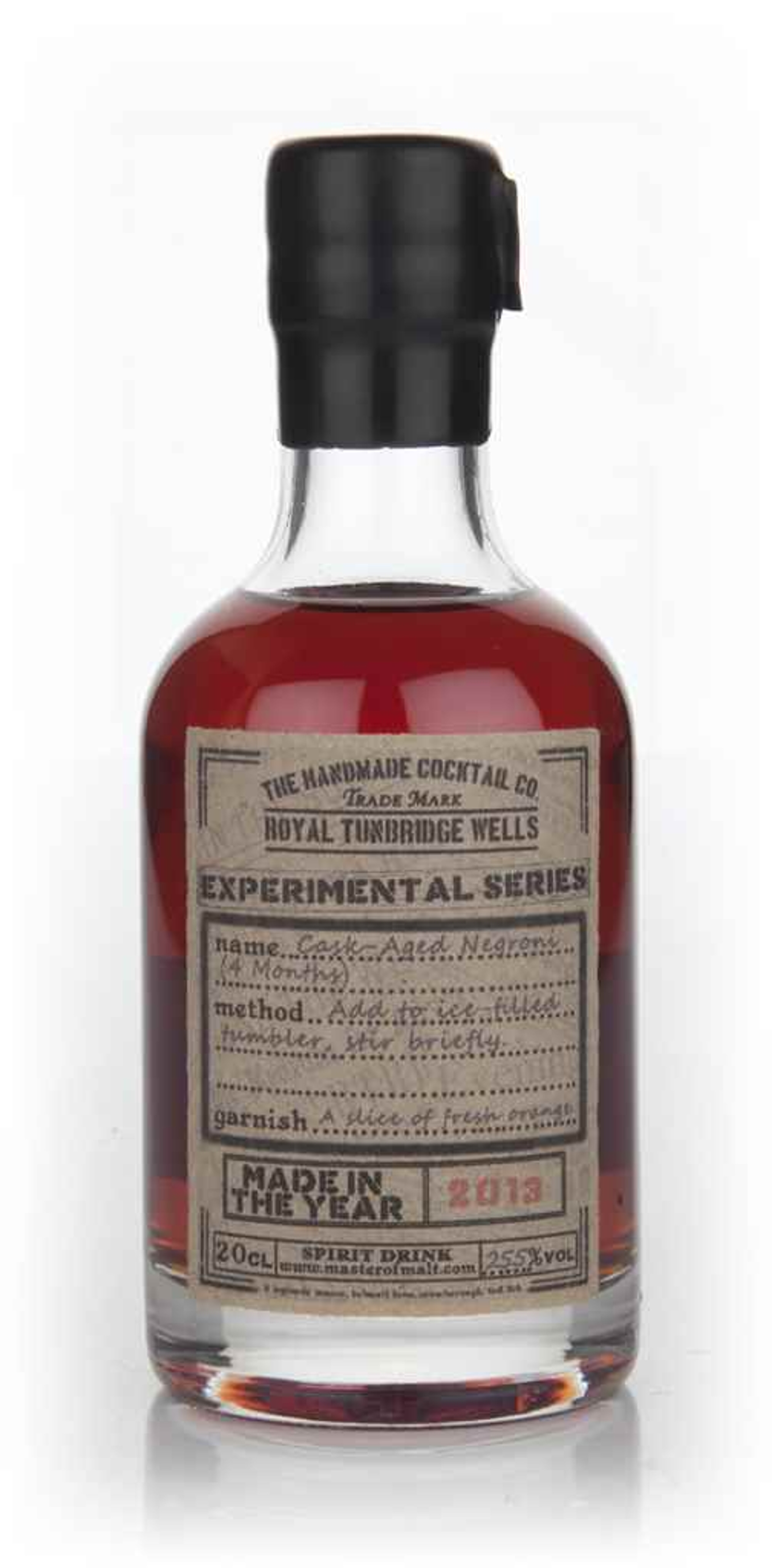 This is a superb vintage cocktail from The Handmade Cocktail Company's Experimental Series. It was made to a classic Negroni recipe with premium-strength English copper pot-still gin, top-quality sweet vermouth and a mix of Campari and Aperol. It was then aged for four months in an oak cask, and the result of this is all kinds of spicy intensity and additional complexity.