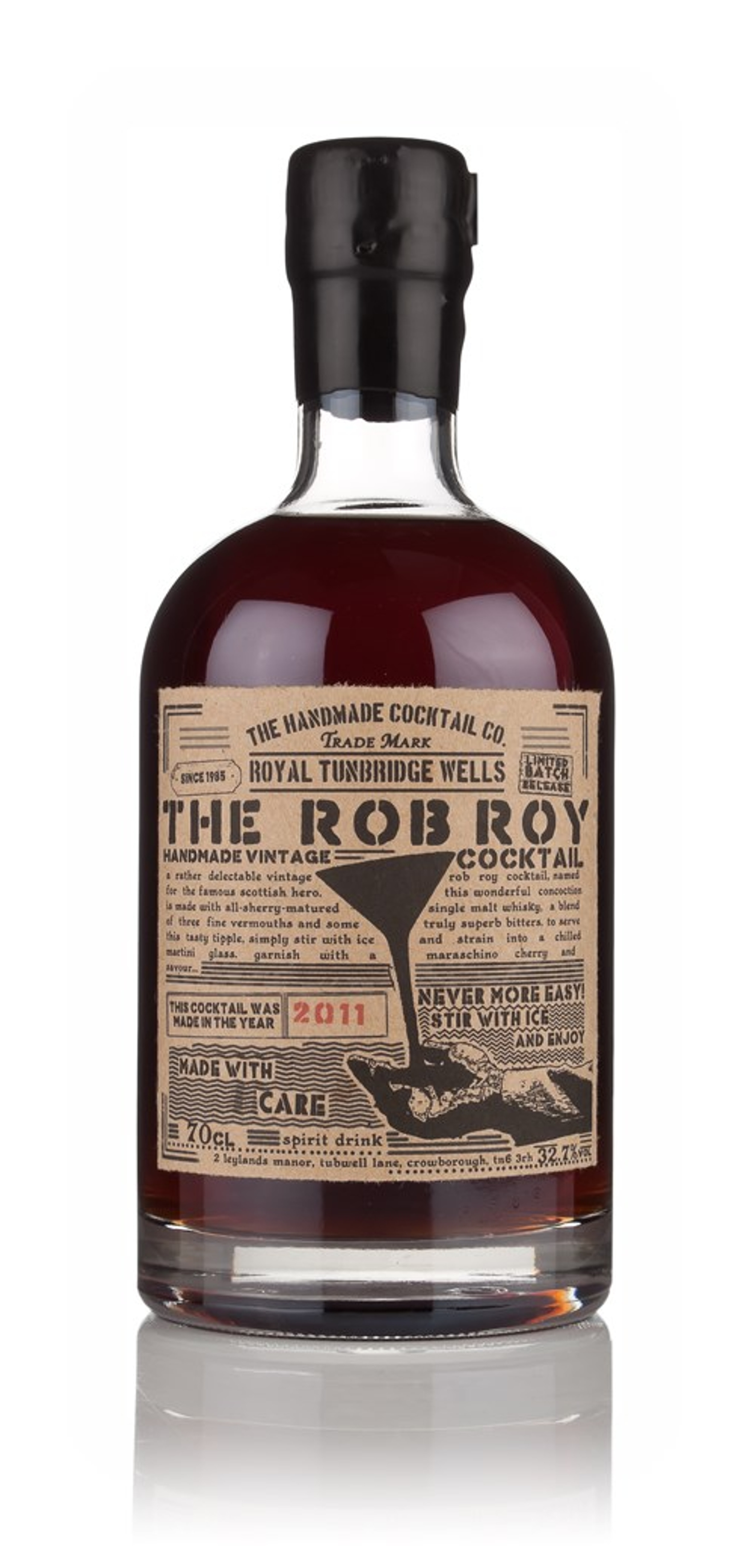 The concept of the ‘Vintage Cocktail’ range is simple – you get all the ingredients for a superb cocktail pre-mixed, all you have to do is pour it over ice, stir, then strain off into your glass and garnish (in this instance with a Maraschino Cherry of course). Each bottle carries a stamp showing its year of manufacture.