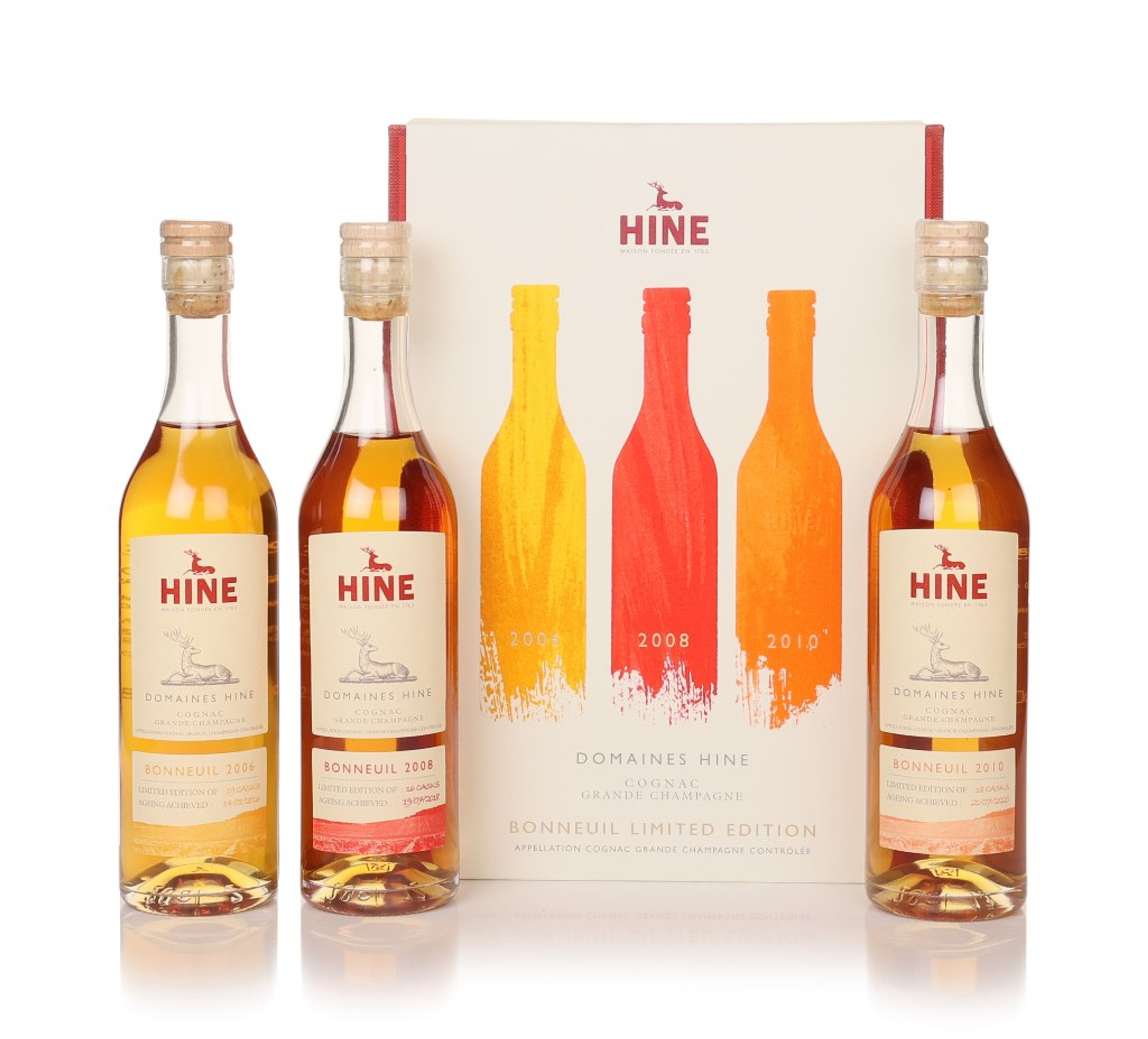 A tremendous trio of vintage expressions from legendary Cognac house Hine's Bonneuil collection. This set includes a 200ml bottle each of Hine Bonneuil 2005, Hine Bonneuil 2006, and Hine Bonneuil 2008. A superb opportunity for Cognac aficionados to try three different vintages side by side.