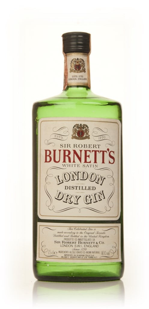 A bottle of Burnett’s White Satin London Dry Gin from sometime during the late 1970s. We've sent an email to Sir Robert himself to try and find out exactly when it's from. He hasn't replied yet.