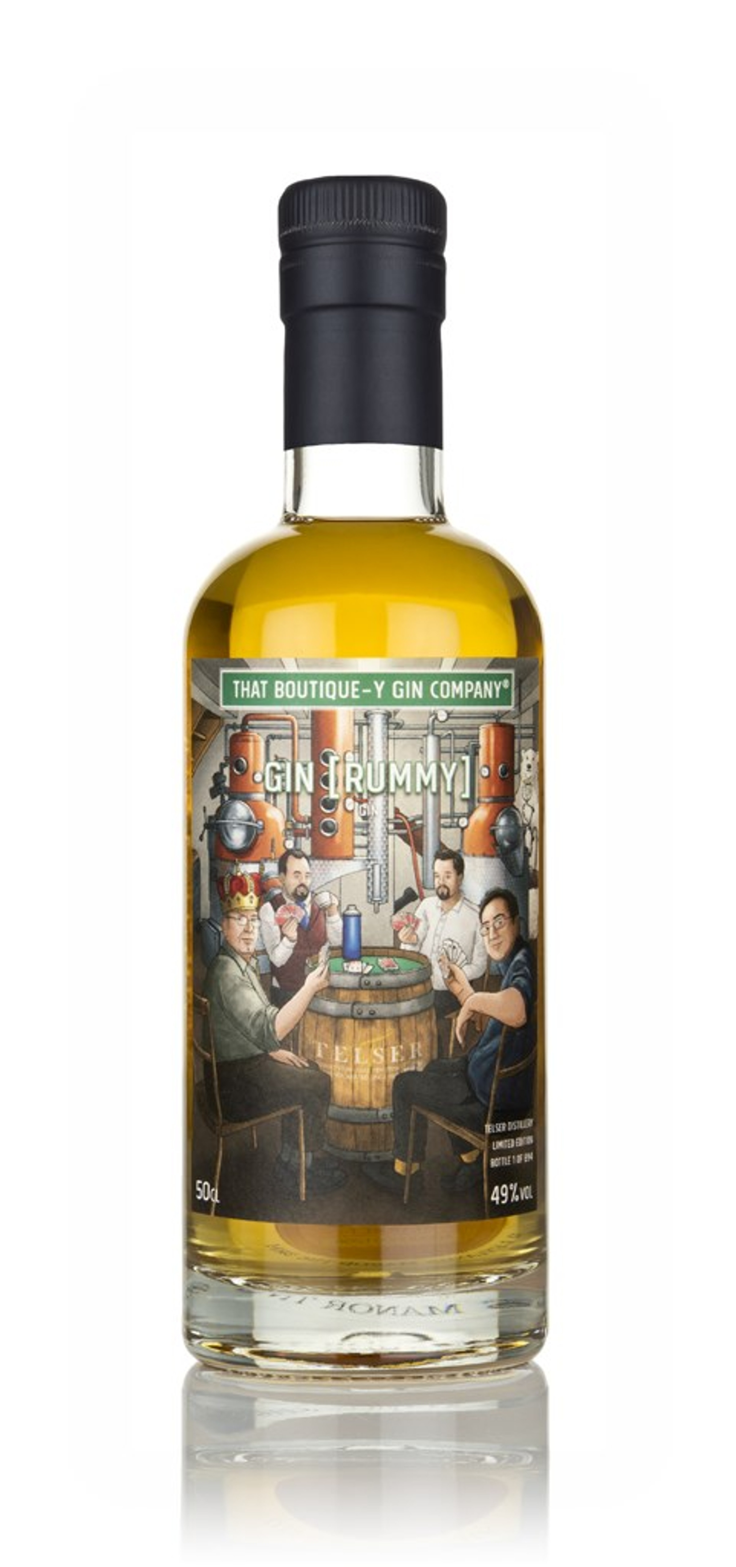 When two spirits collide, tasty things happen. This right here is an example of those aforementioned tasty things. The Telser distillery in Liechtenstein has created Gin[Rummy] for That Boutique-y Gin Company by combining its Telser London Dry Gin with its Tesler Rum! Aptly, the distillers (and a few familiar Boutique-y faces) are playing an intense game of Gin Rummy on the label. You can tell who is winning because they're wearing a crown.