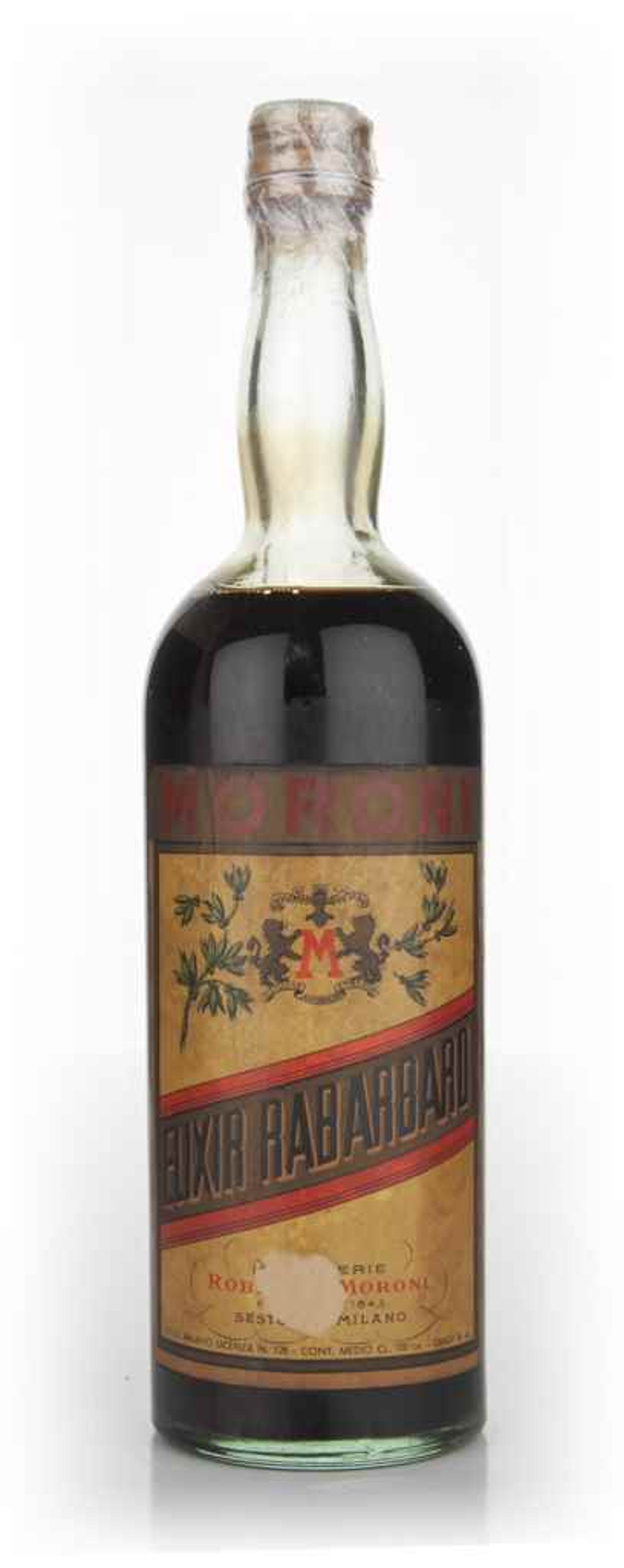 This is a very rare and highly collectible 1960s bottle of Elixir Rabarbaro - a bittersweet Italian liqueur made with rhubarb. This was made by the Moroni company based in Milan, Italy.