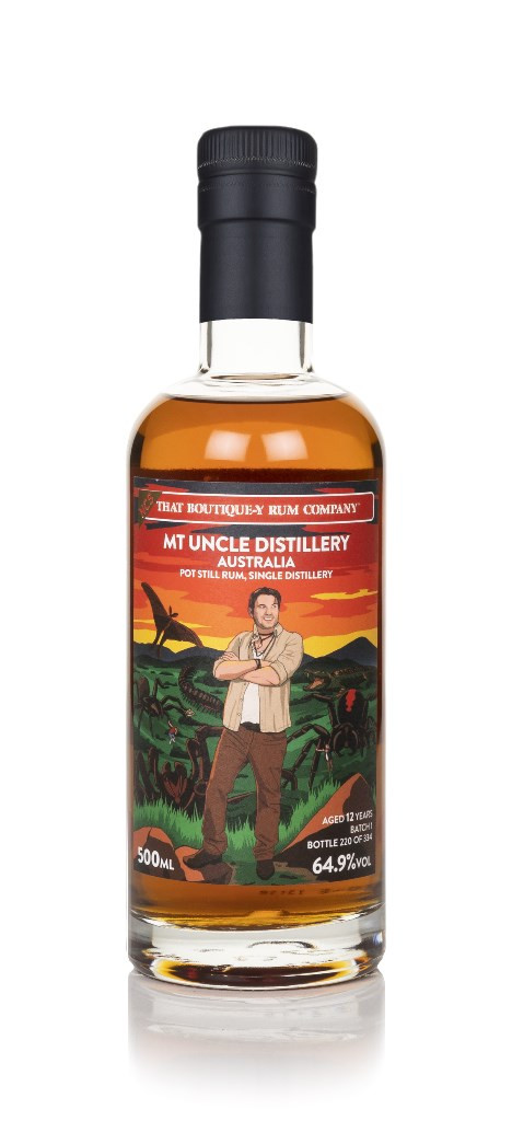 Pot still rum from Mt Uncle distillery, part of That Boutique-y Rum Company's Return to Oz collection. Made with sugar cane syrup sourced from a local factory, and combined with dunder, this rum then gets distilled on a 1,500 litre Holstein pot still. This rum was then matured for an impressive 12 years in a heavily toasted hogshead that previously held red wine. Distillery founder Mark Watkins features on the label, along with a whole range of supersized critters.
