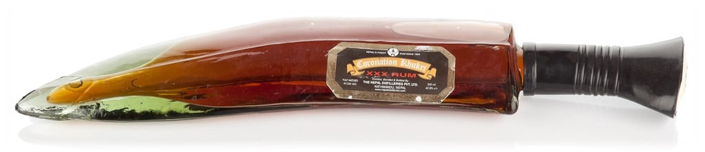 Rum from Nepal! Produced at the only Himalayan distillery, Coronation Khukri XXX Rum was first launched in 1974 to mark the coronation of His Royal Highness Shri Birendra Bir Bikram Shah Dev and this bottle dates from the 2000s. The khukri-shaped bottle is made by hand.