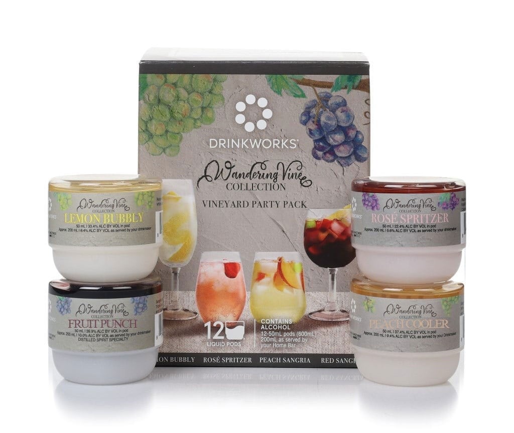 A great value box of Drinkworks cocktail pods, featuring their 'Wandering Vine' favourites Lemon Bubbly and Rose Spritzer, as well as the Iberian influenced Fruit Punch and Peach Cooler...