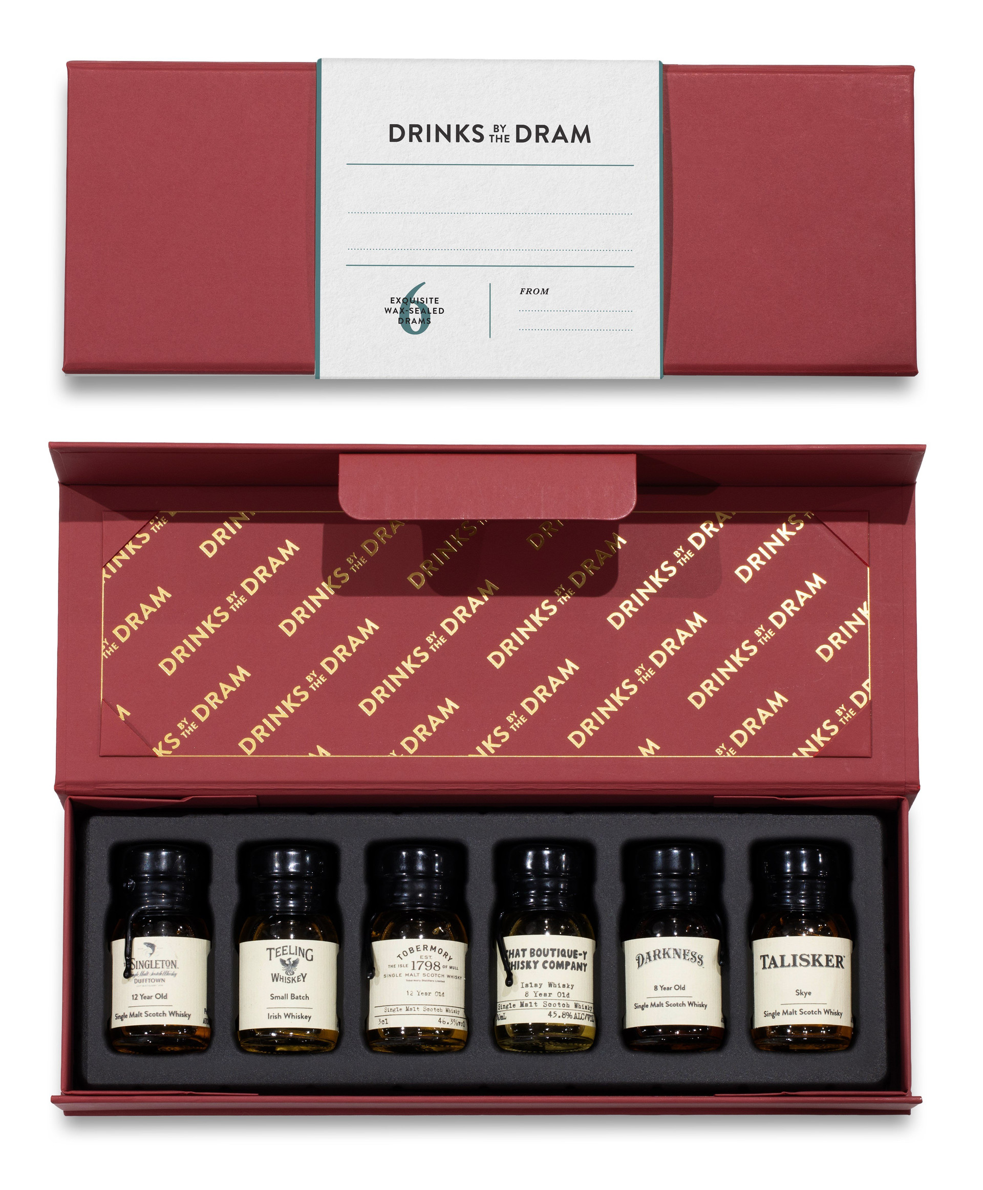 Within this box await six wax-sealed 30ml whisky samples from some of the world's top distilleries and producers, and you can transform it into the perfect personalised gift by adding your own message to the sleeve! There's enough space to write a nice greeting, or perhaps a poem. Include a doodle if you like. It's a blank canvas.