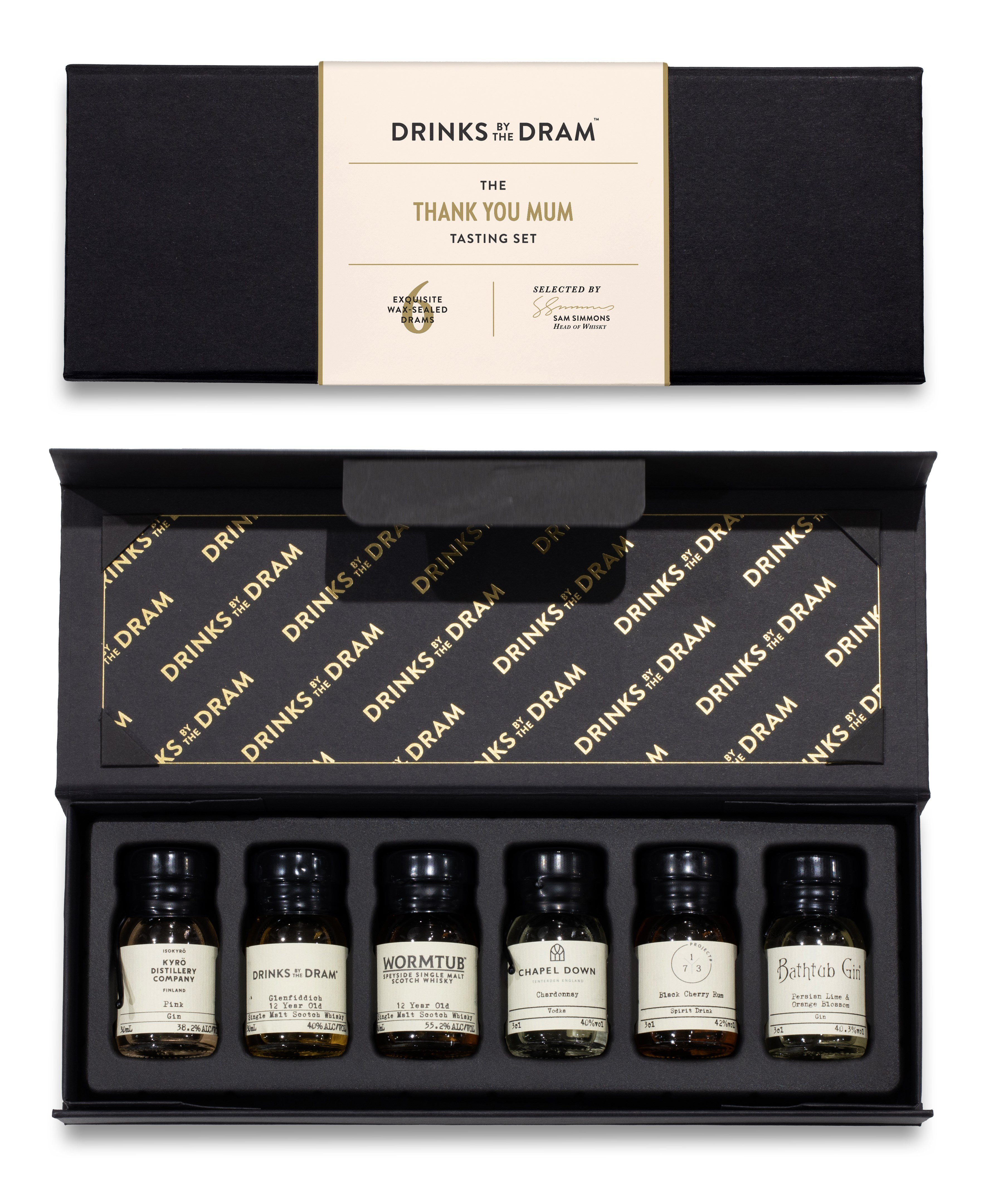 A selection of six spirit tasters, chosen to ensure any day for a Mother is filled with delight! This collection includes six 30ml wax-sealed samples from some of the world's most impressive producers, housed in a smart black box – an ideal gift for a spirits lover.