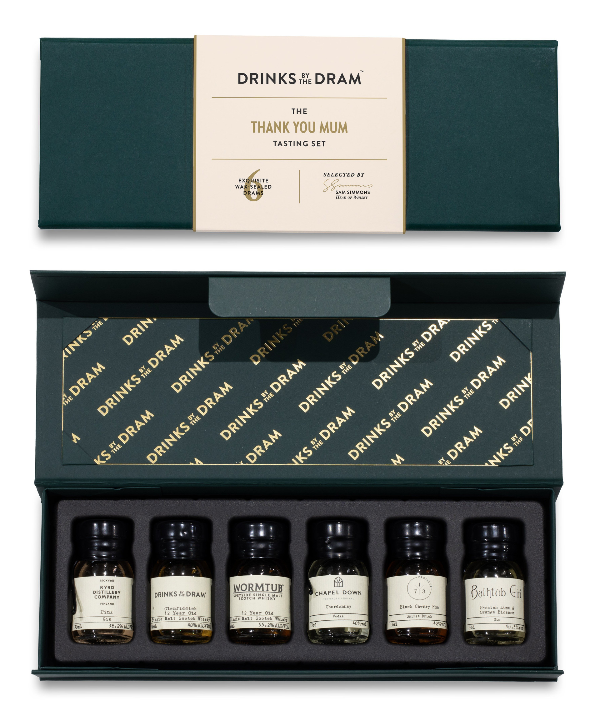 A selection of six spirit tasters, chosen to ensure any day for a Mother is filled with delight! This collection includes six 30ml wax-sealed samples from some of the world's most impressive producers, housed in a smart green box – an ideal gift for a spirits lover.