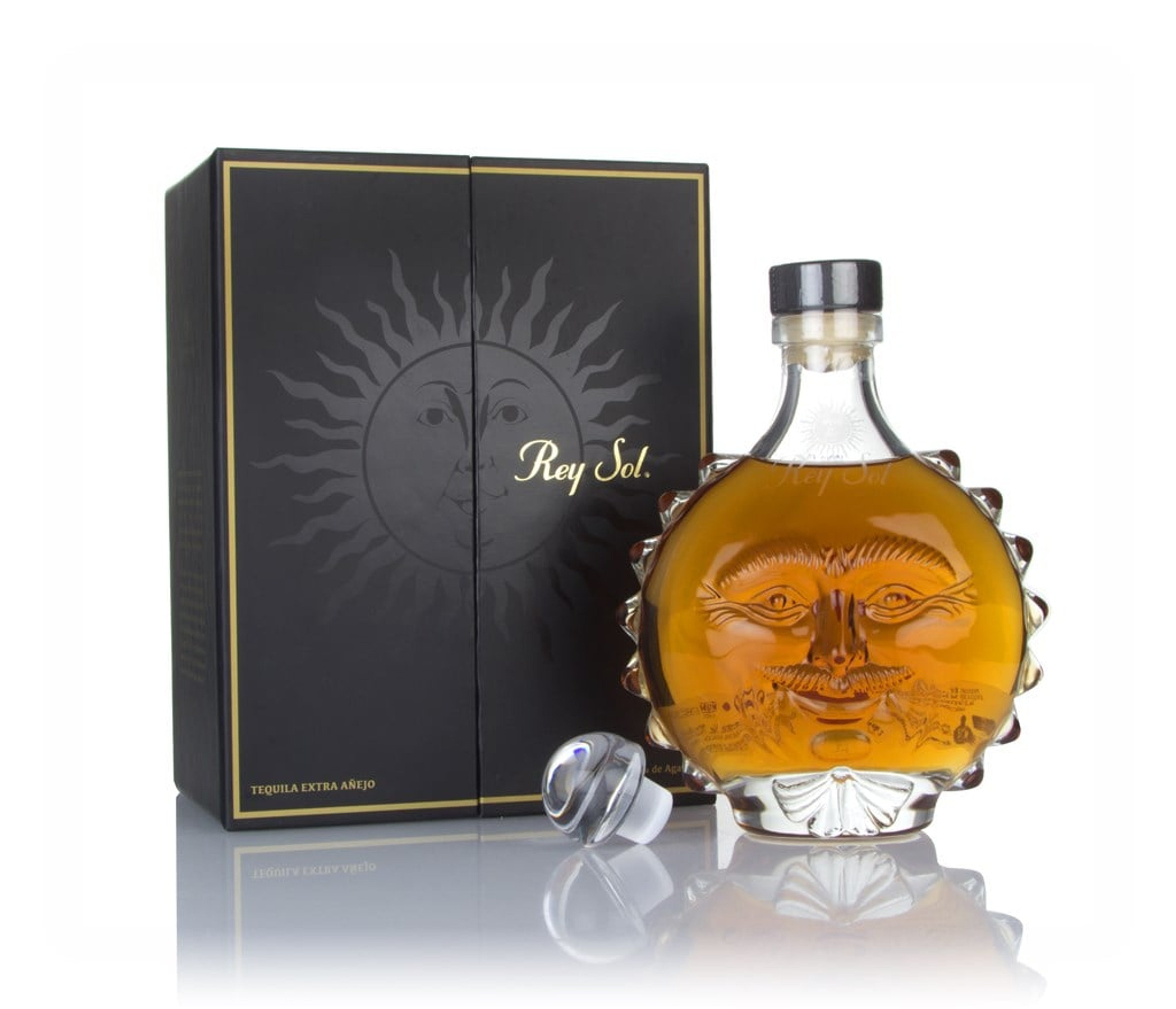 Rey Sol is a spectacular extra añejo Tequila from San Matias, made with agave plants that have aged for 7 to 10 years before being harvested. The Tequila itself is matured for 6 years, and presented in decanters designed by Mexican artist Sergio Bustamante. The bottle is shaped like the sun, complete with a rather cheerful face, an admirable moustache and a bow tie. What's not to like here?
