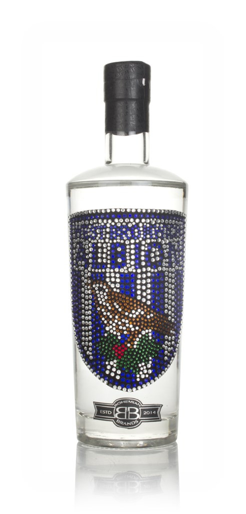 A bottle of five-times distilled British grain vodka from Bohemian Brands, featuring the West Bromwich Albion FC badge on the front. The badge includes a throstle perched on a hawthorn branch, which is wonderful.