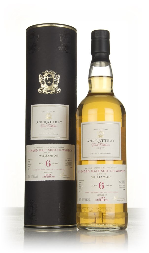 An independently-bottled blended malt from A.D. Rattray. It's a spooned whisky, meaning that it's predominantly made with one single malt, along with a tiny helping of single malt from another distillery. This 6 year old expression was drawn from a single sherry butt, producing 509 bottles.
