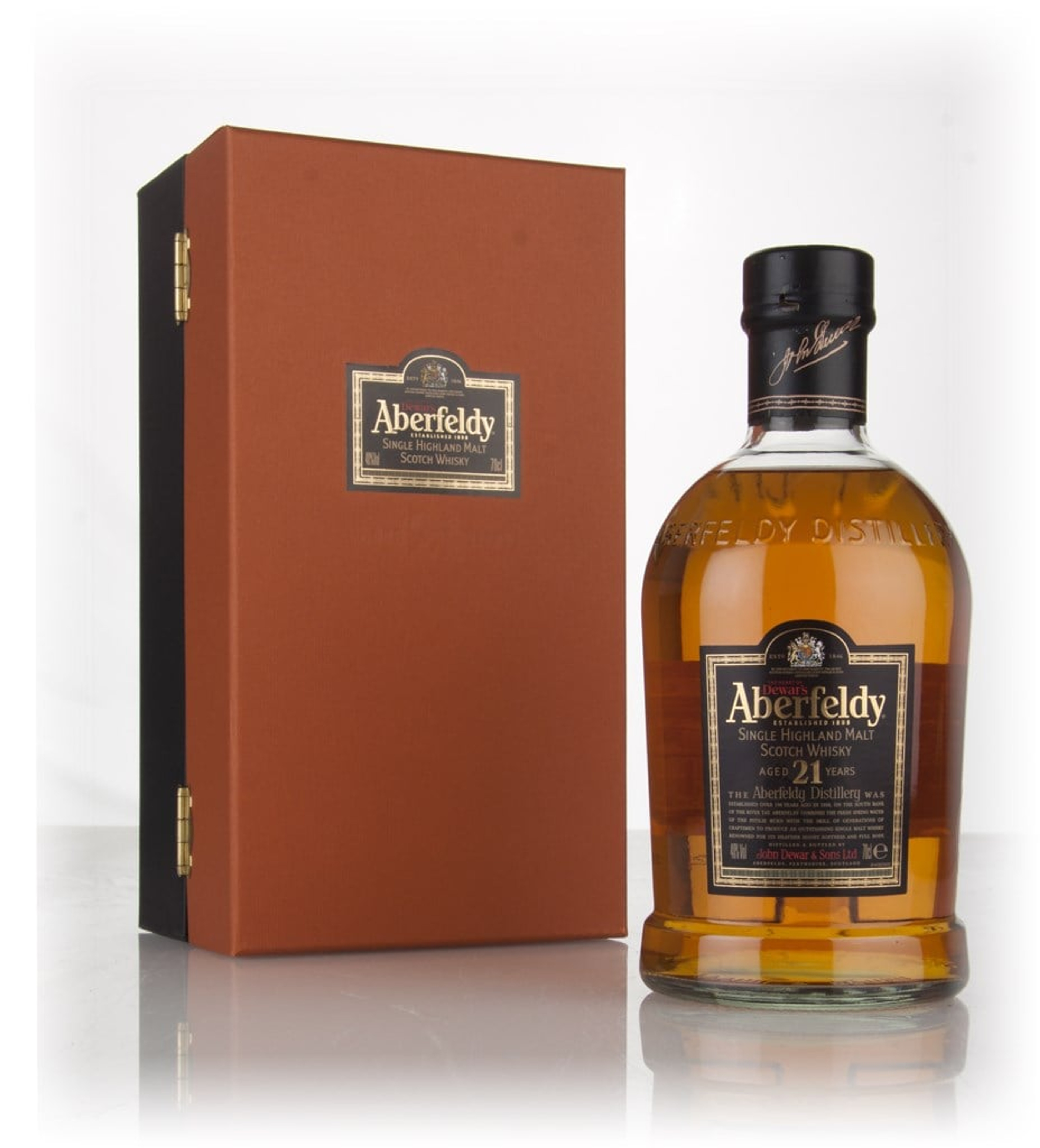 An old bottling of the Aberfeldy 21-year-old dating from the 2000s, housed in its signature dumpy bottle, complete with presentation box.