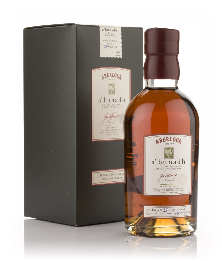 It's Aberlour's ever-popular A'Bunadh single malt Scotch whisky! Each batch of this single malt is matured entirely in Spanish oloroso sherry butts, bestowing huge helpings of dried fruit and festive spice notes to the whisky, after which it's bottled up at full-on cask strength with no chill-filtration.
