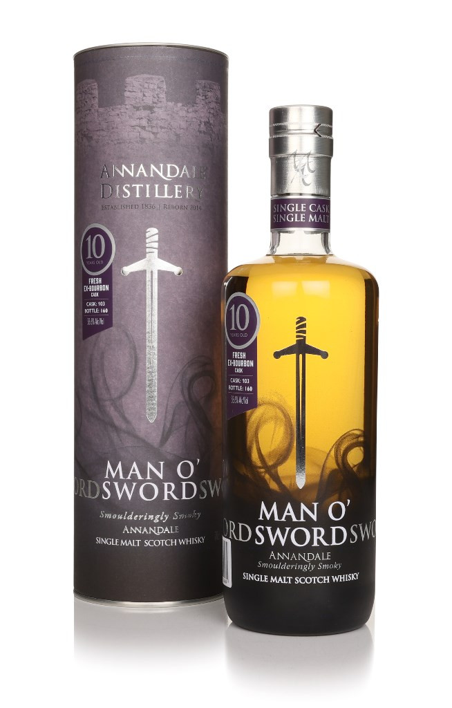 This is the first public release of Annandale's peated Man O’Sword single malt to bear a 10-year age statement! Distilled in 2014, the whisky spent a decade in a fresh bourbon barrel (number 103) before bottling. An exciting and impressive milestone for the recently revived Lowland distillery.