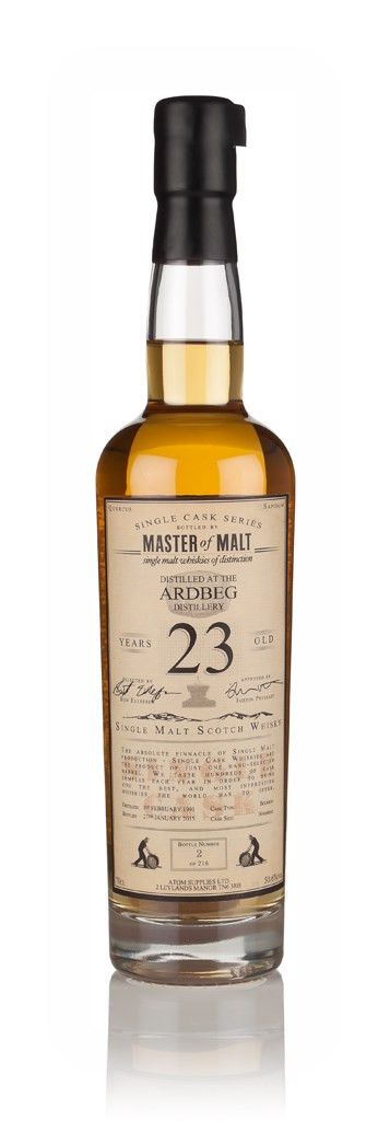 Hold on to your hats, folks, because we've gone and bottled some 23-year-old Ardbeg! That's right, our Single Cask Series grows larger with the addition of a 23-year-old single malt Scotch whisky, which was distilled in February 1991 by the legendary Islay distillery, set aside to mature in a bourbon cask and eventually bottled in January 2015 with an outturn of 216 bottles.