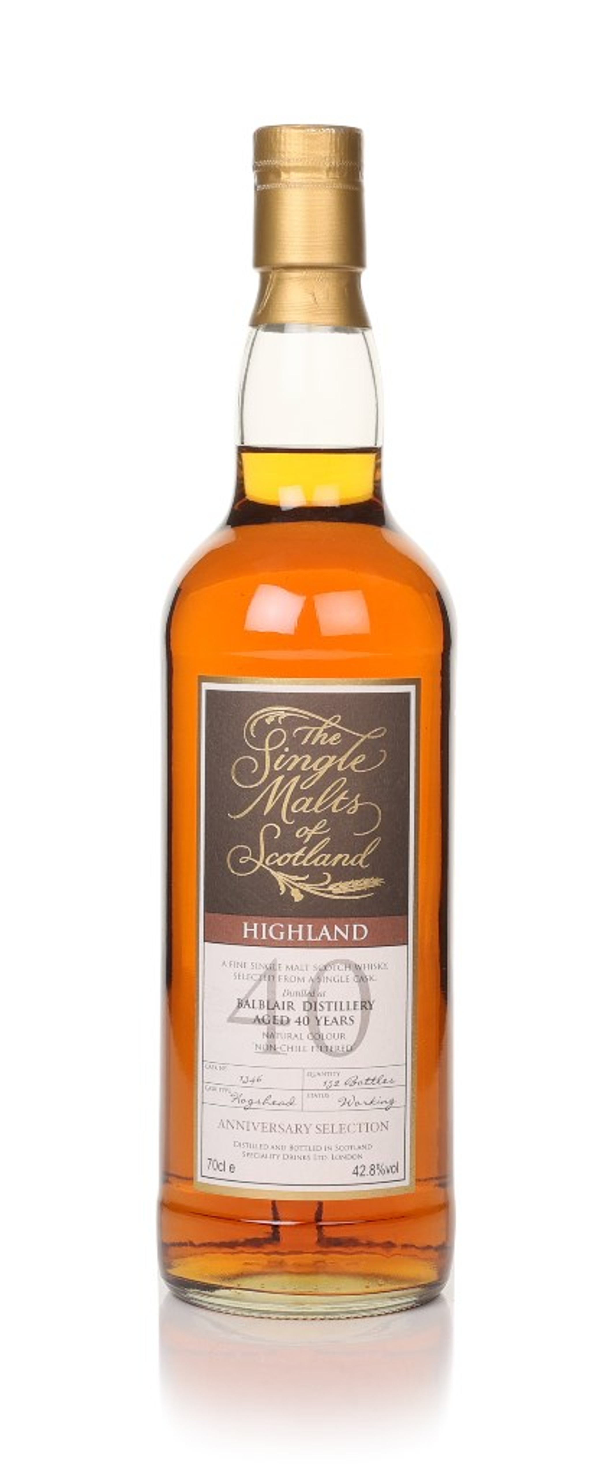 Single malt from Balblair, matured in a single hogshead for a whopping 40 years. Independently bottled by Speciality Drinks, a total of 152 bottles were released for The Single Malts of Scotland series.