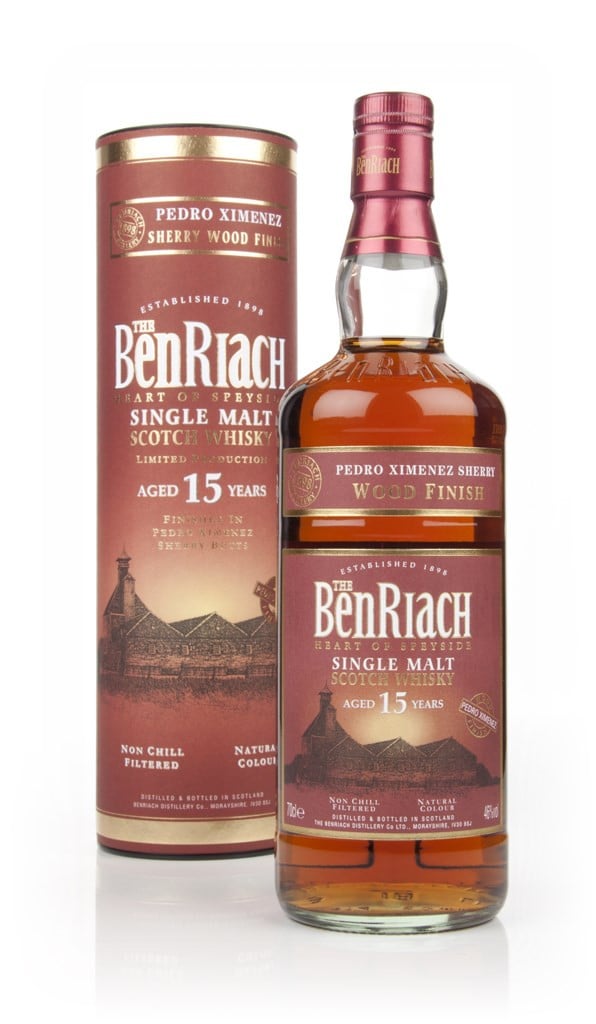 A 15 year old from Benriach. This Speysider was initially matured in American oak bourbon barrels before a finish in casks from the bodegas of Jerez de la Frontera in Andalucia, Southern Spain, previously used to mature Pedro Ximenez sherry.
