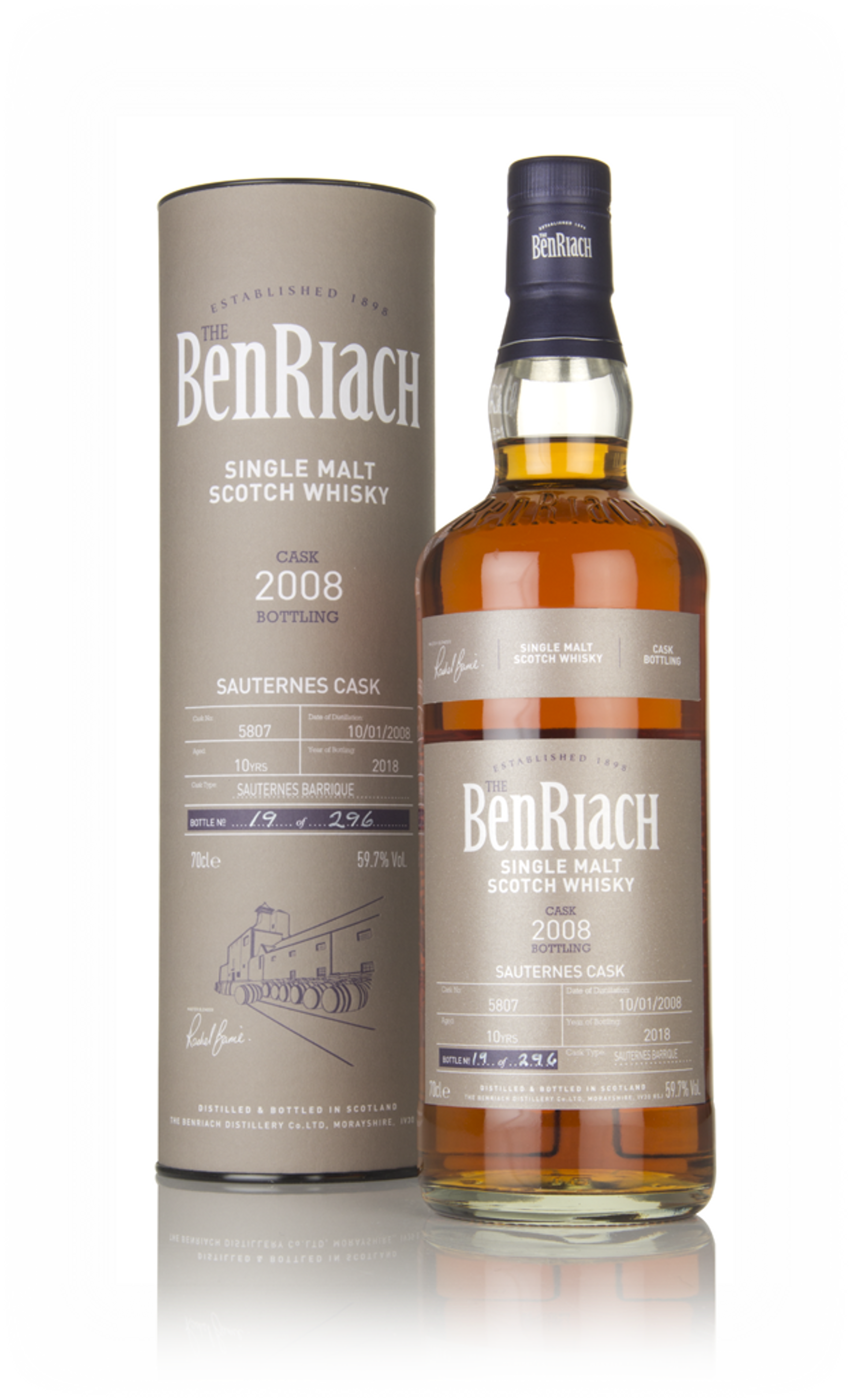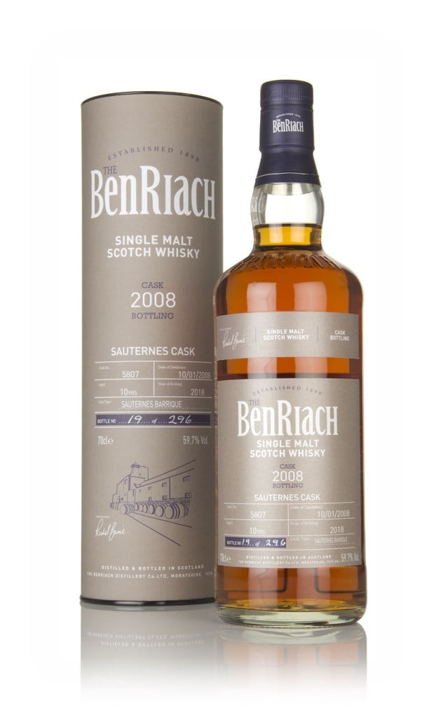 10 year old single malt from the BenRiach distillery. matured in a cask that previously held wonderfully sweet Sauternes wine! This expression was distilled in January 2008 and bottled in 2018 for the 15th batch of BenRiach's single cask releases, with only 296 bottles produced.