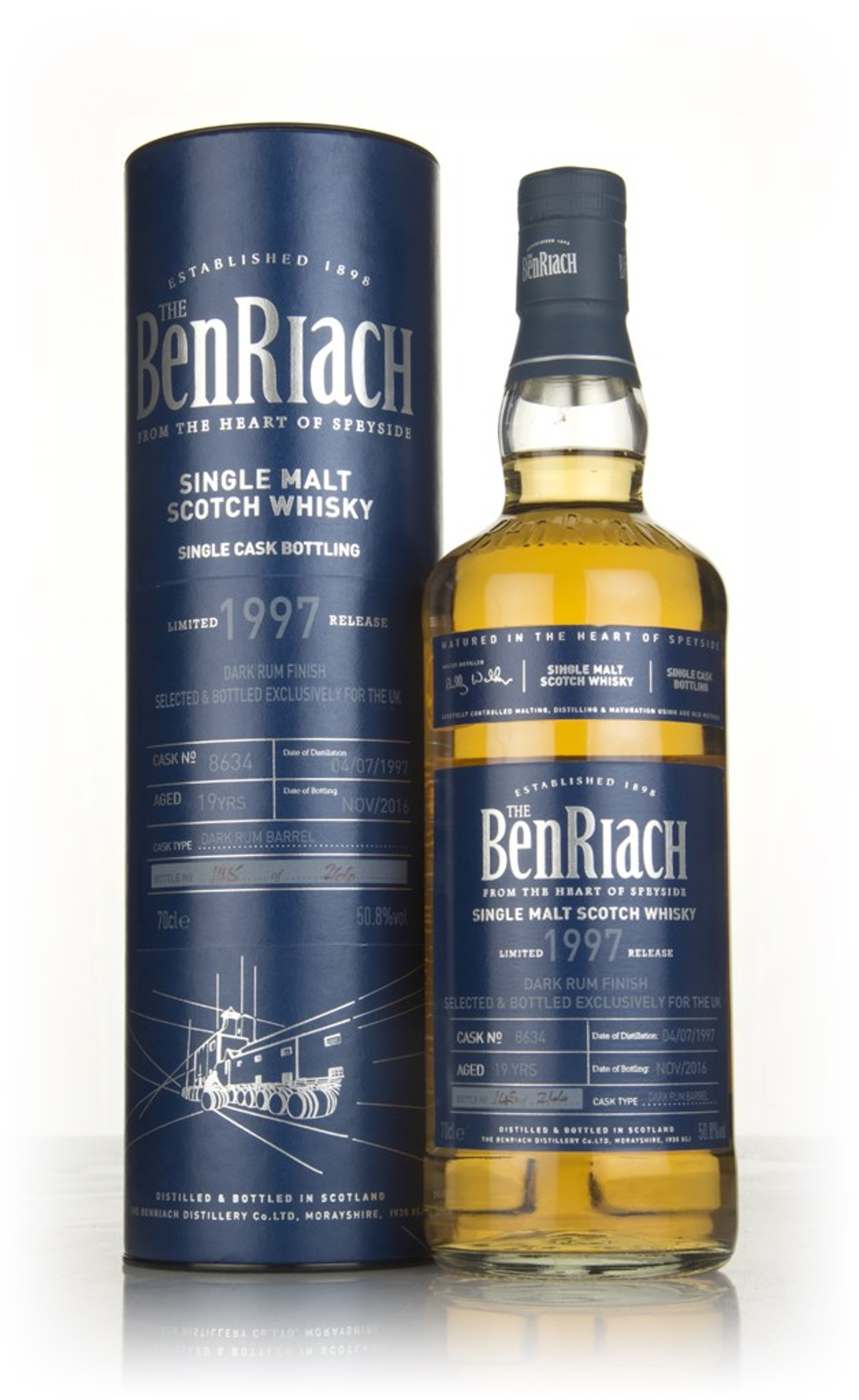 Released exclusively for the UK, this 19 year old Benriach single malt enjoyed a finishing period in a cask that previously held dark rum. It was distilled in July 1997 and bottled in November 2016 following the aforementioned rum cask finishing. There are just 266 of these, so grab one while you can.