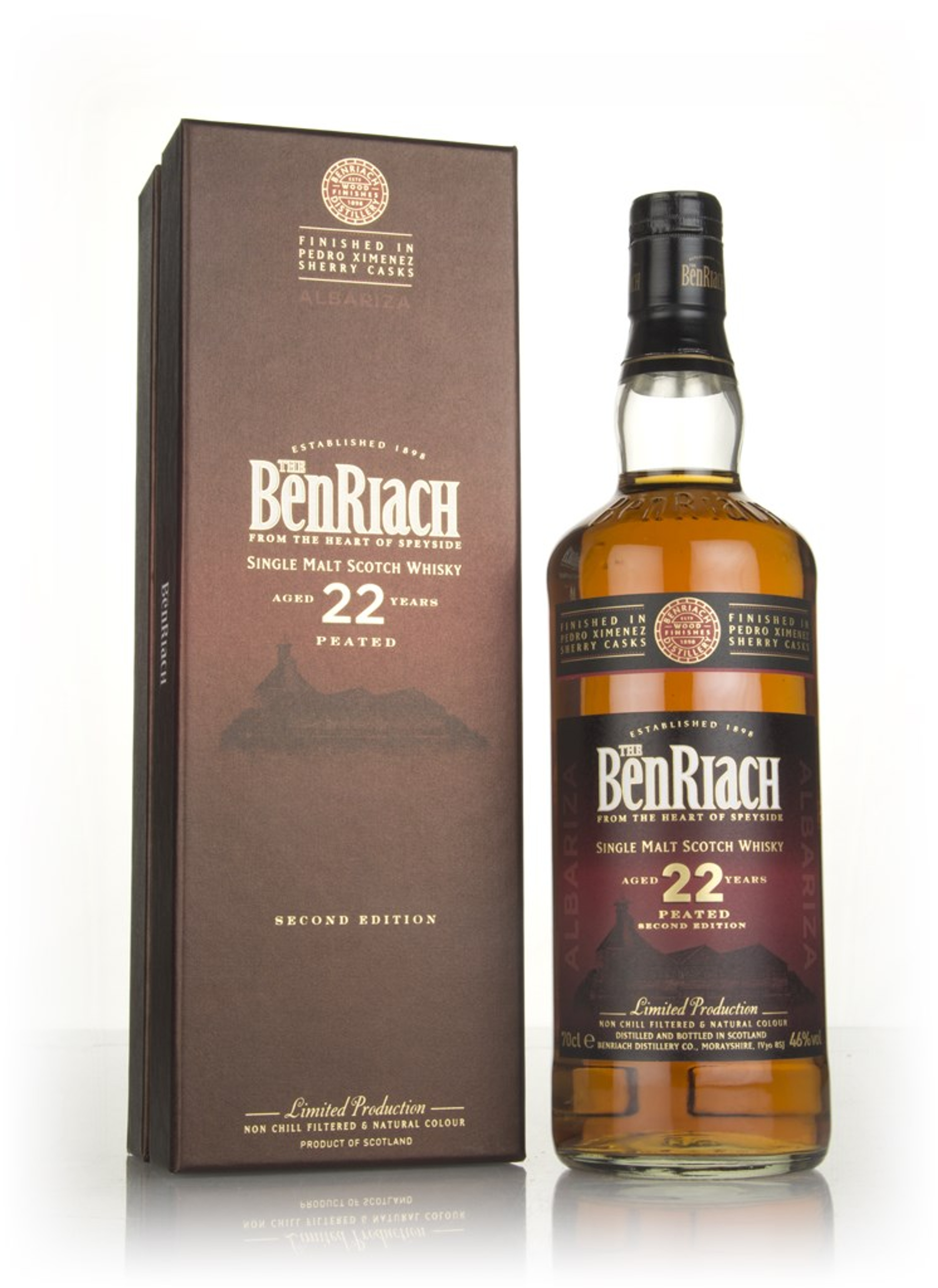 Distilled and bottled by Benriach, this 22 Year Old single malt Scotch whisky is finished in Pedro Ximenez Sherry casks, which imparts a rich, fruity sweetness to the robust, peated Benriach flavour profile.