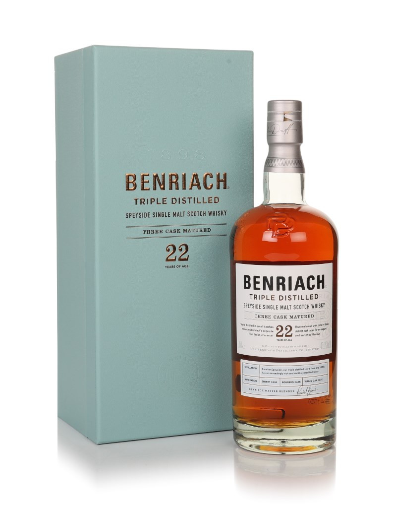 Triple distilled in the 1990s and matured in three different types of cask, it's a magnificent 22-year-old single malt from Benriach. Combining whisky drawn from a host of sherry, bourbon, and virgin oak casks, master blender Dr. Rachel Barrie has expertly enhanced the rich, fruit-laden character of the Speyside-based distillery's classic style.