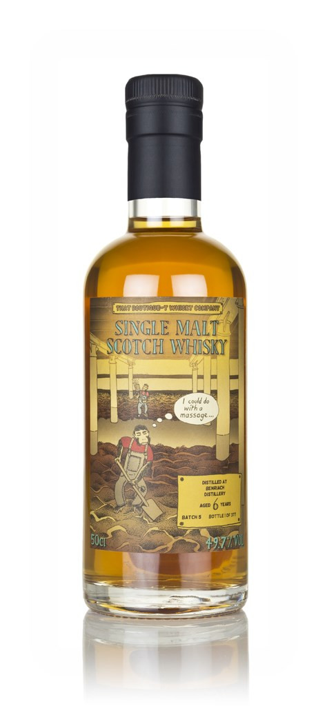 Single malt from the Benriach distillery, independently bottled by That Boutique-y Whisky Company. Another bananas label sits upon this Boutique-y bottle, referencing the origin of the phrase "monkey shoulder". Y'see, being a maltster is rather touch work, and after a long time of turning the malt of a malt floor (like the one at Benriach), they might develop a hunch, colloquially referred to as a "monkey shoulder".