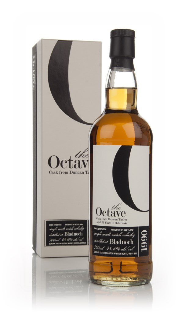 An Octave bottling of 23 year old Bladnoch single malt Scotch whisky, bottled by Duncan Taylor. It was distilled in 1990 and bottled in 2013 with a tiny outturn of 88 bottles, due to the tiny Octave casks (they're 8 times smaller than Sherry butts).