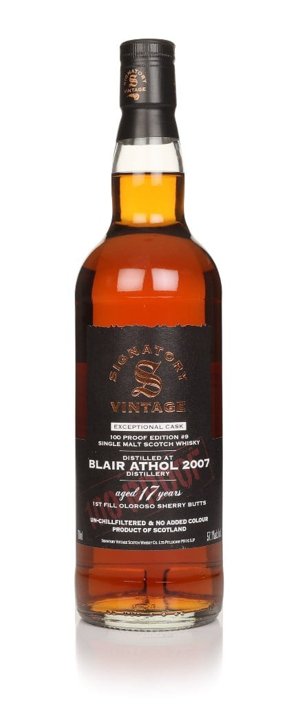 Distilled in 2007, this impressive single malt from Blair Athol spent 17 years maturing in a host of first fill oloroso sherry butts. The casks were opened by Signatory, independently bottling the whisky at a robust 57.1% ABV for its 100 Proof Editions, without added colour or chill filtration.