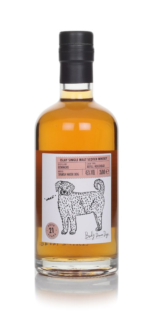How well do you reckon you could draw a Spanish Water Dog? Our dog drawing master, Cal, has done a rather excellent job here, don't you think? He's named this dog Maxamillion, and he adorns the label of a rather fetching single malt from Bowmore! This Islay furball spent 21 years maturing in a refill hogshead before we bottled it in diddy 350ml format for the Badly Drawn Dogs collection.