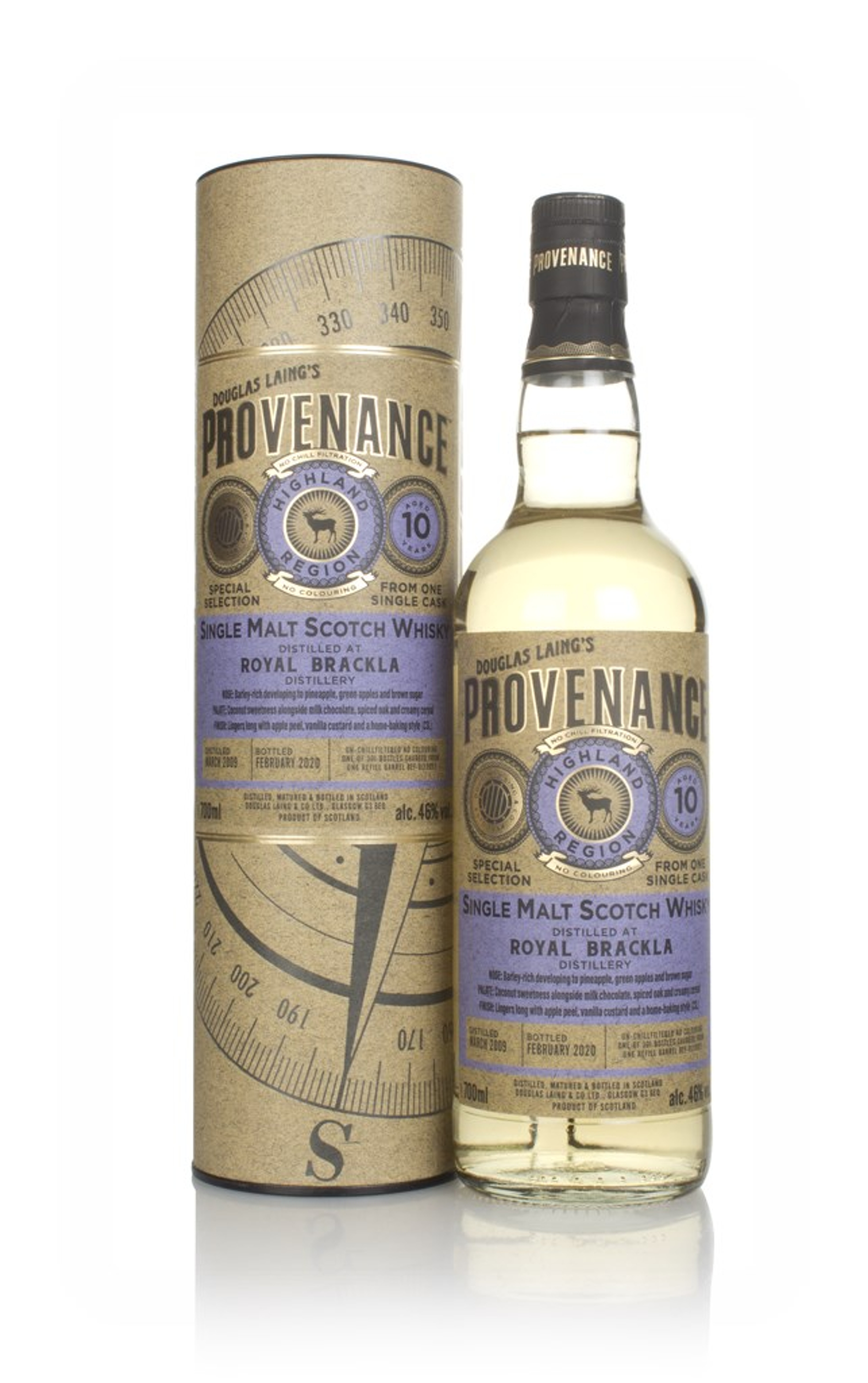 This is a 10 year old single malt from the Brackla Distillery (the first Scottish distillery to receive 'royal' status, we'll have you know!), independently bottled by Douglas Laing. It was distilled back in March 2009 and left to age in a refill barrel for a decade, before being bottled in February 2020. Only 301 bottles were produced.