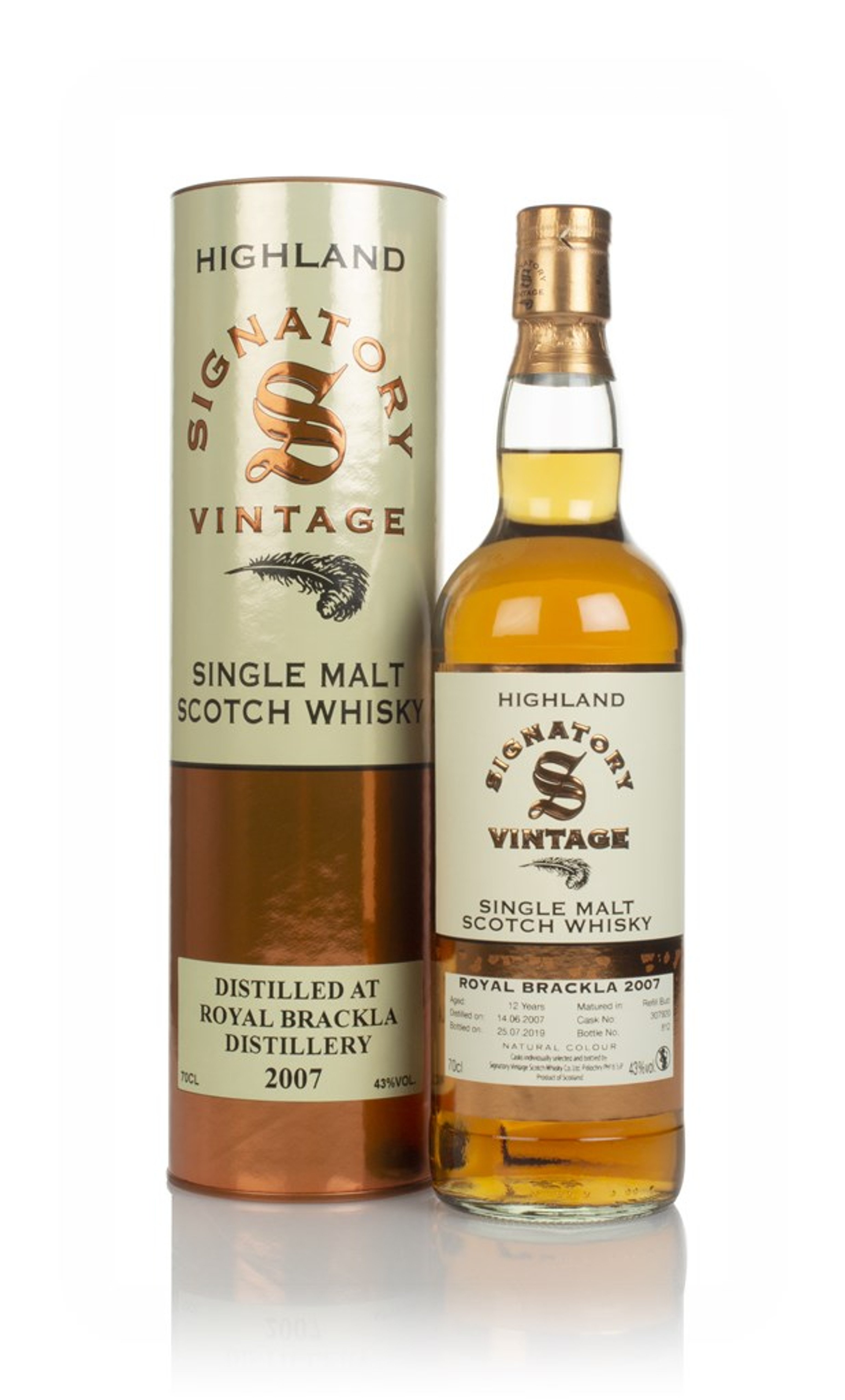 Single cask single malt from Royal Brackla right here, independently bottled by Signatory after 12 years of maturation. It was set aside to age in a refill butt back in June 2007, and then bottled a dozen years later in July 2019, complete with a shiny presentation tube.