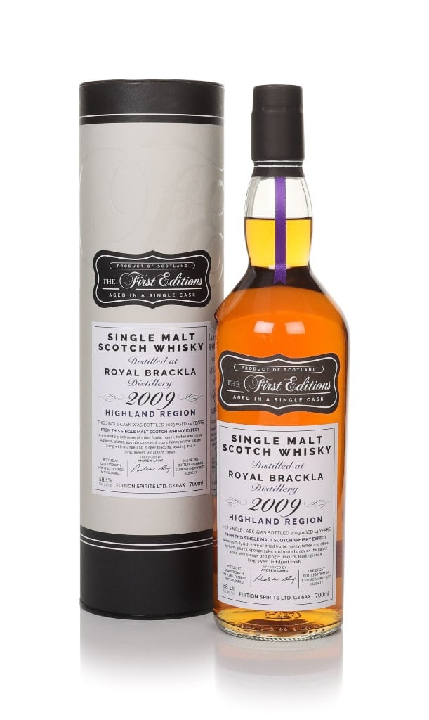 The First Editions (Hunter Laing) presents a Royal Brackla single malt Scotch whisky aged for 14 years in a single oloroso sherry butt (cask #20617). The vintage 2009 expression was bottled at 58.1% ABV without chill-filtration or additional colouring.