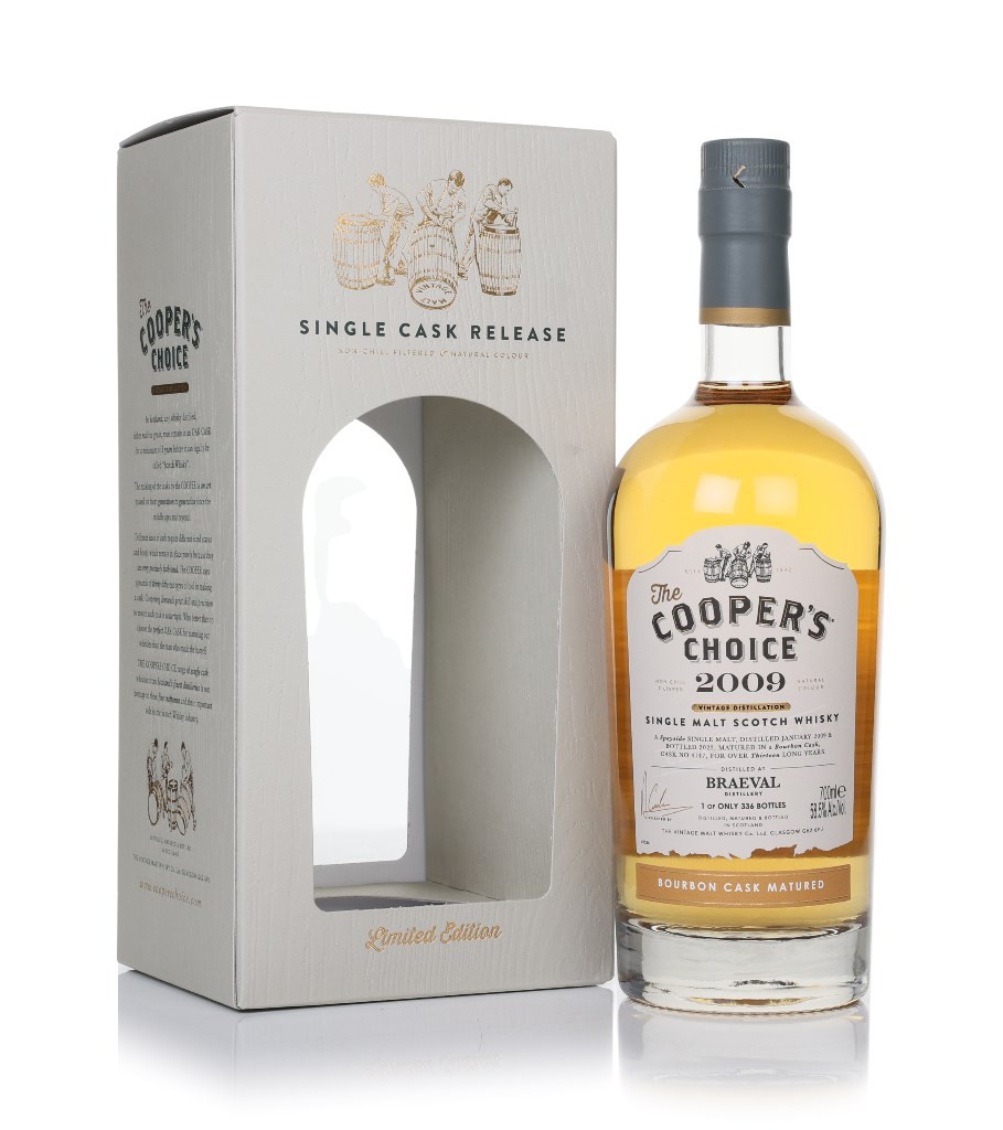 This limited edition Speyside single malt was distilled at Braeval in January 2009. It matured in a single bourbon cask for 13 years before being bottled by The Vintage Malt Whisky Co. for The Cooper's Choice series. Non-chill filtered and naturally coloured, only 336 bottles were produced.
