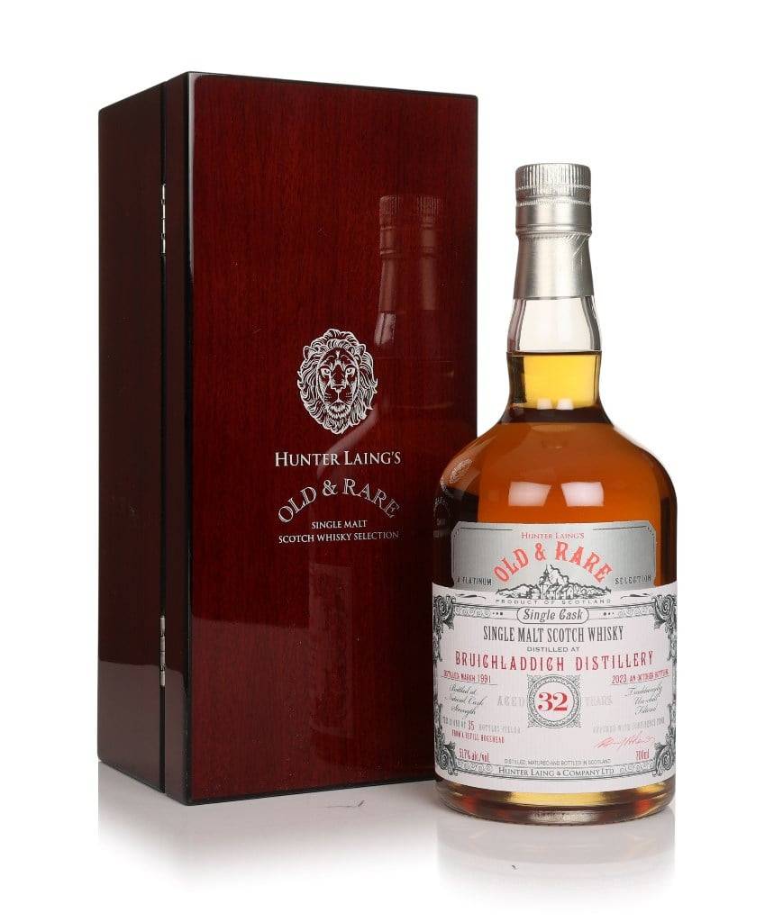 This generously aged single malt from Bruichladdich joins Hunter Laing's Old & Rare Platinum collection. Distilled in 1991, the whisky spent 32 years maturing in a refill hogshead, with just 35 cask strength bottles filled for this limited release in October 2023.